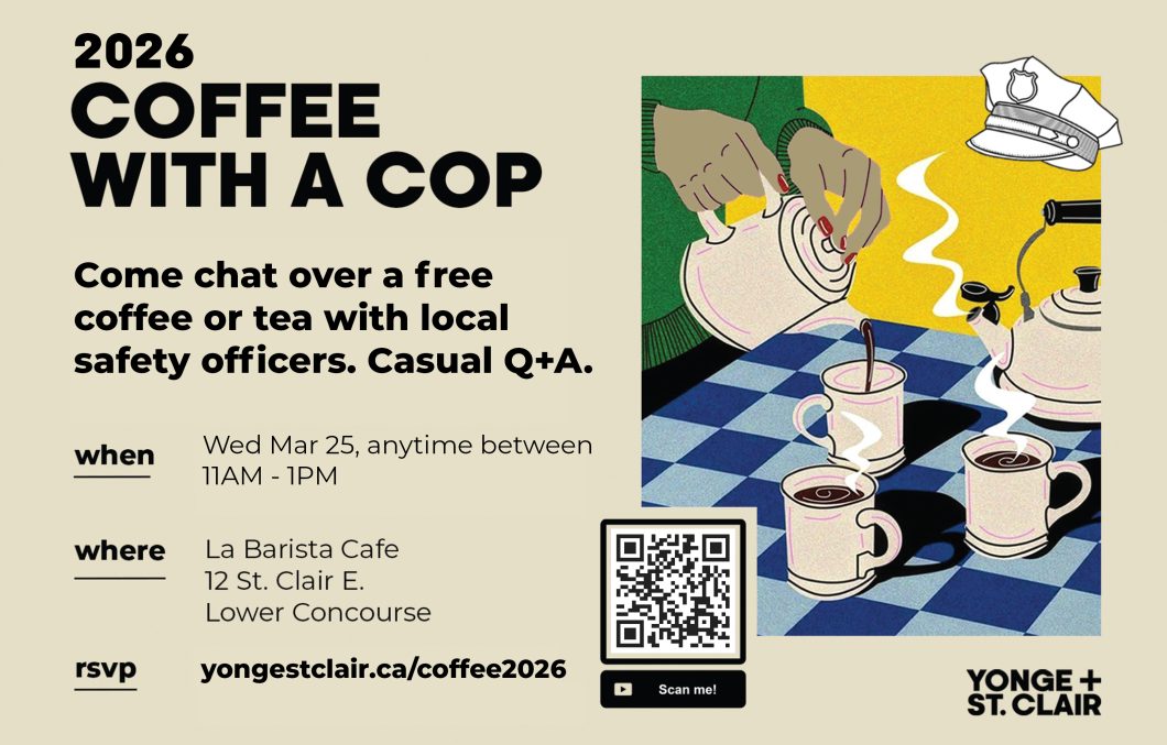 Coffee with is a Cop is a public, drop-in meet and greet event, bringing Yonge + St. Clair’s police team (53 Division) together with members of public alongside local business owners for a casual chat and coffee or tea. This event series is designed to provide a chance for you to meet your local police team, ask any questions you’ve been curious about regarding police duties, and learn about the safety plan for Yonge + St. Clair throughout 2026.